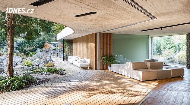 Otevřením domu směrem do exteriéru se dovnitř opticky vtáhne zahradní jezero se vzrostlými stromy na jeho březích, i okolní nevšední skalnatá scenérie.