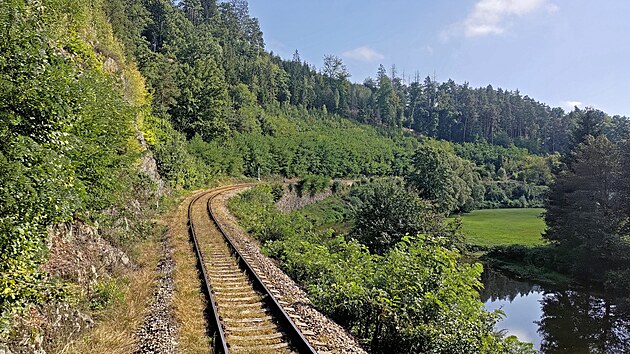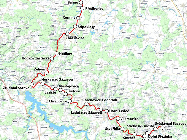 A teď si držte si klobouky, pojedeme z kopce. Od Štipoklas[13] přes Zbraslavice[14] a Hodkov[15] trať prudce klesá až k řece Sázavě. Po pár kilometrech se napojujeme na již zmíněný Posázavský Pacifik, je tady stanice Zruč nad Sázavou[16].