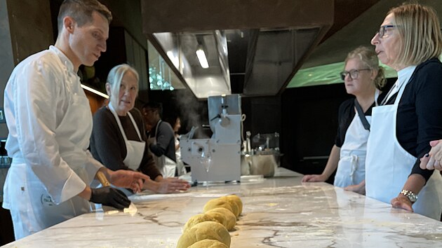 Je nás čtrnáct. Dostáváme sklenku místního vína Trento Doc, oblékneme si kuchařské zástěry a seřadíme se u dlouhého masivního stolu, kde je připraveno čtrnáct mističek s moukou, rozšlehané žloutky v hrníčcích, vidličky a kuchyňské stěrky. „Vysypejte mouku na stůl a udělejte z ní kruh,“ začíná lekci vaření šéfkuchař Stefano Rossi.