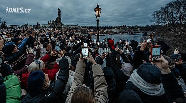 O pár minut se i ta rozzáří, stejně jako tváře turistů, kterých dál přibývá. Na Karlově mostě to v době rozsvěcování plynového osvětlení připomíná ranní špičku v tokijském metru. Jen zde nikdo nespěchá, téměř kompaktní masa následuje lampáře, který je momentálně za hvězdu.