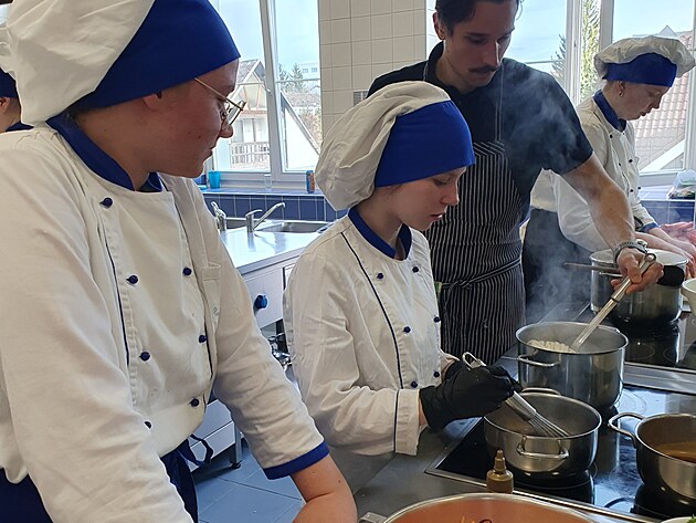 Nezaháleli ale ani ti, kteří zůstali ve škole. V rámci kurzu rostlinného vaření si žáci třetího ročníku oboru gastronomie vyzkoušeli pokrmy mezinárodních kuchyní – od italských ravioli přes falafel a hummus až po guacamole a dýňové risotto s kešu a parmezánem. Pracovali ve čtyřech týmech, hodnotili své výtvory a soutěžili o nejlepší umístění.